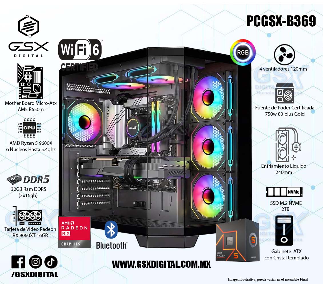 PC AMD RYZEN 5 9600X - RX 9060XT 16GB - 32GB RAM DDR5 - 2TB SSD NVME - FUENTE 750W CERTIFICADA - WIFI Y BLUETOOTH - ENFRIAMIENTO LIQUIDO PCGSX-B369