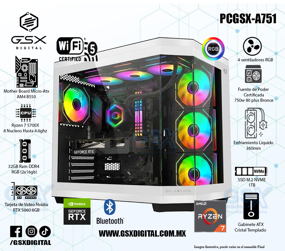 PC AMD RYZEN 7 5700X - RTX 5060 8GB - 32GB RAM RGB - 1TB SSD NVME - FUENTE 750W CERTIFICADA - ENFRIAMIENTO LIQUIDO PCGSX-A751
