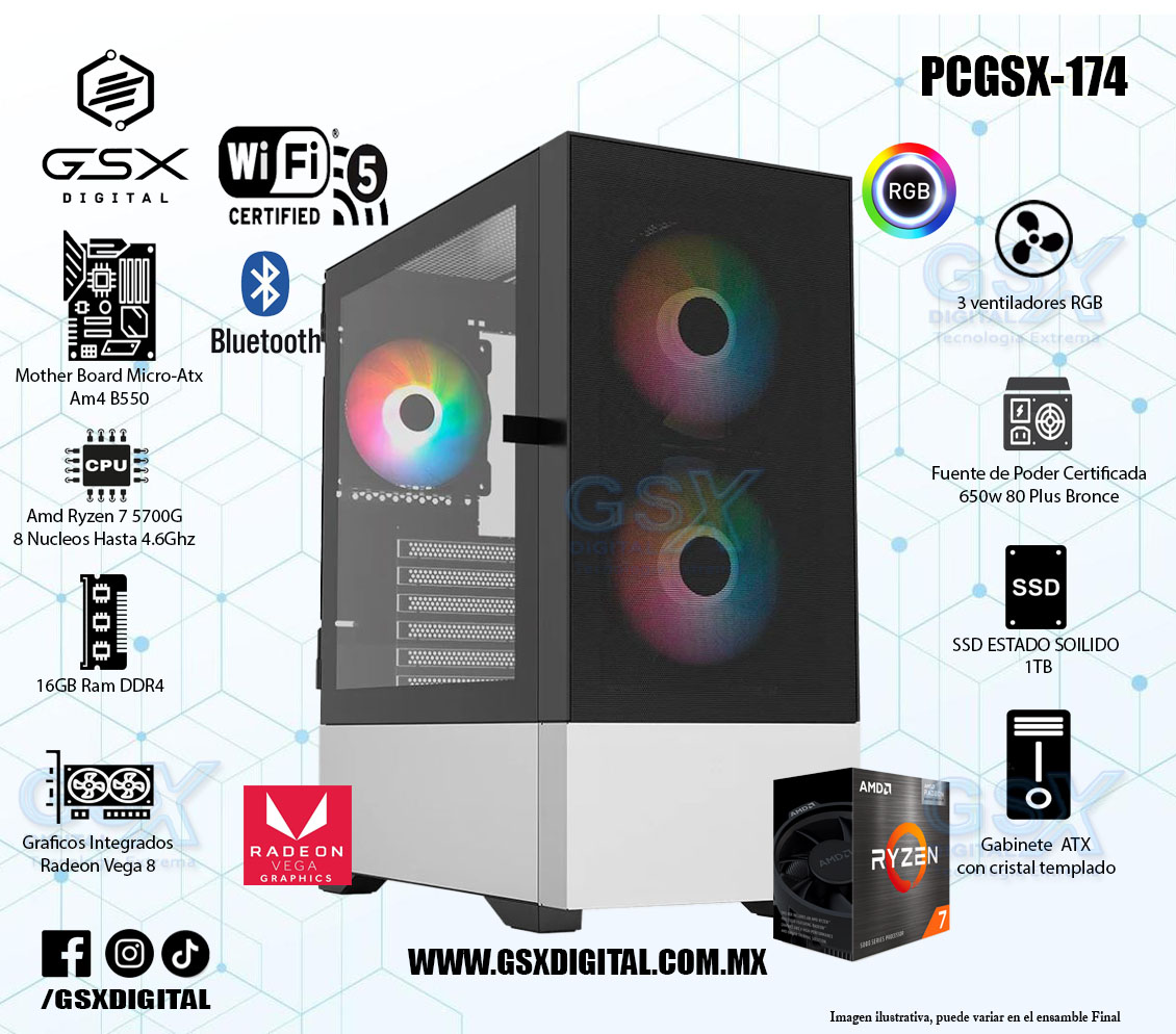 PC GAMER AMD RYZEN 7 5700G - 16GB RGB - 1TB SSD - CRISTAL TEMPLADO - 3 VENTILADORES RGB - FUENTE 650W CERTIFICADA - Wifi y Bluetooth PCGSX-174