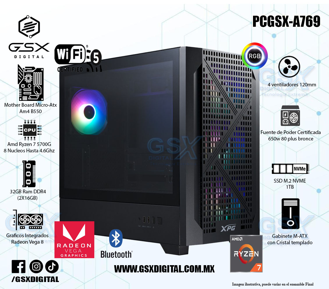 PC GAMER AMD RYZEN 7 5700G - 32GB RAM DDR4 - 1TB SSD NVME - FUENTE 650W CERTIFICADA - WIFI - BLUETOOTH PCGSX-A769