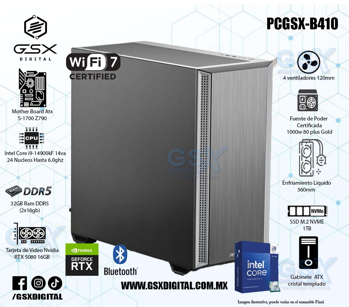 PC INTEL CORE I9-14900KF - RTX 5080 16GB - 32GB RAM DDR5 - 1TB SSD NVME - FUENTE 1000W CERTIFICADA - ENFRIAMIENTO LIQUIDO - WIFI Y BT PCGSX-B410