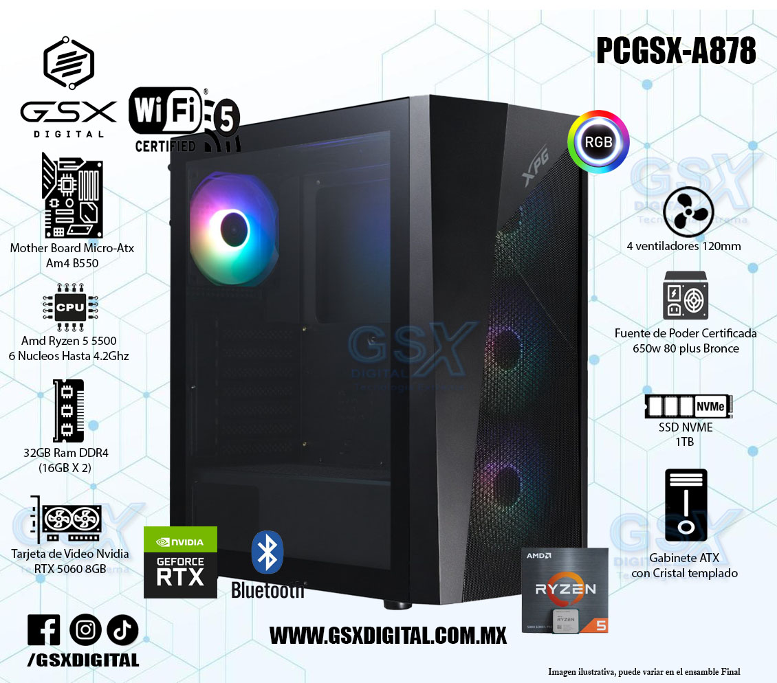 Pc Amd Ryzen 5 - RTX 5060 8GB - 32Gb Ram - SSD 1TB Nvme - Fuente Certificada 650W - Wifi y Bluetooth PCGSX-A878