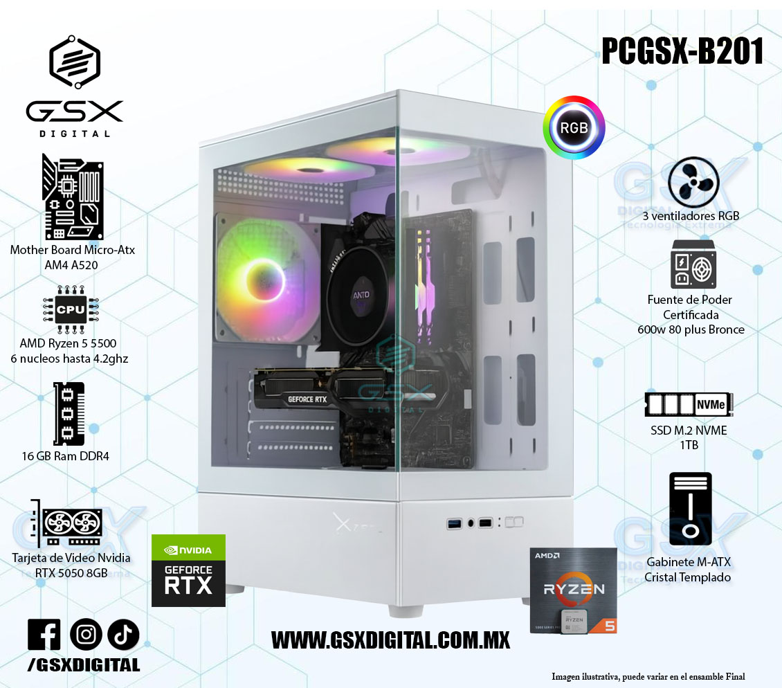 Pc Gamer Ryzen 5 - RTX 5050 8GB - 16Gb Ram Rgb - SSD 1TB Nvme - Fuente Certifica 650W PCGSX-B201