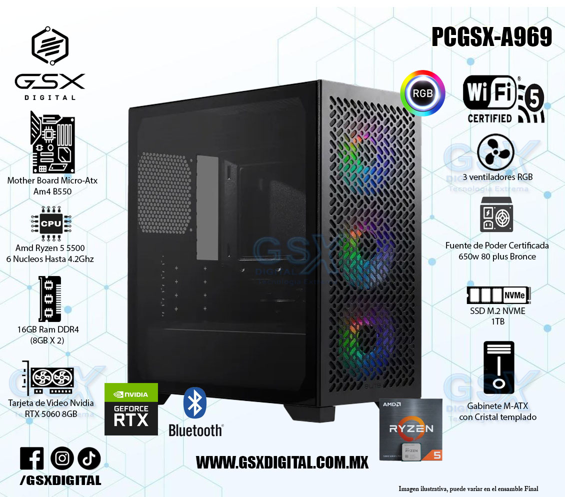 Pc Gamer Ryzen 5 - RTX 5060 8GB - 16Gb Ram DDR4 - SSD 1TB Nvme - Fuente Certifica 650W - Wifi y BT PCGSX-A969