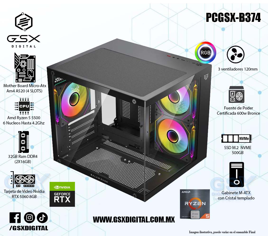 Pc Gamer Ryzen 5 - RTX 5060 8GB - 32Gb Ram DDR4 - SSD 500GB Nvme - Fuente Certifica 600W PCGSX-B374