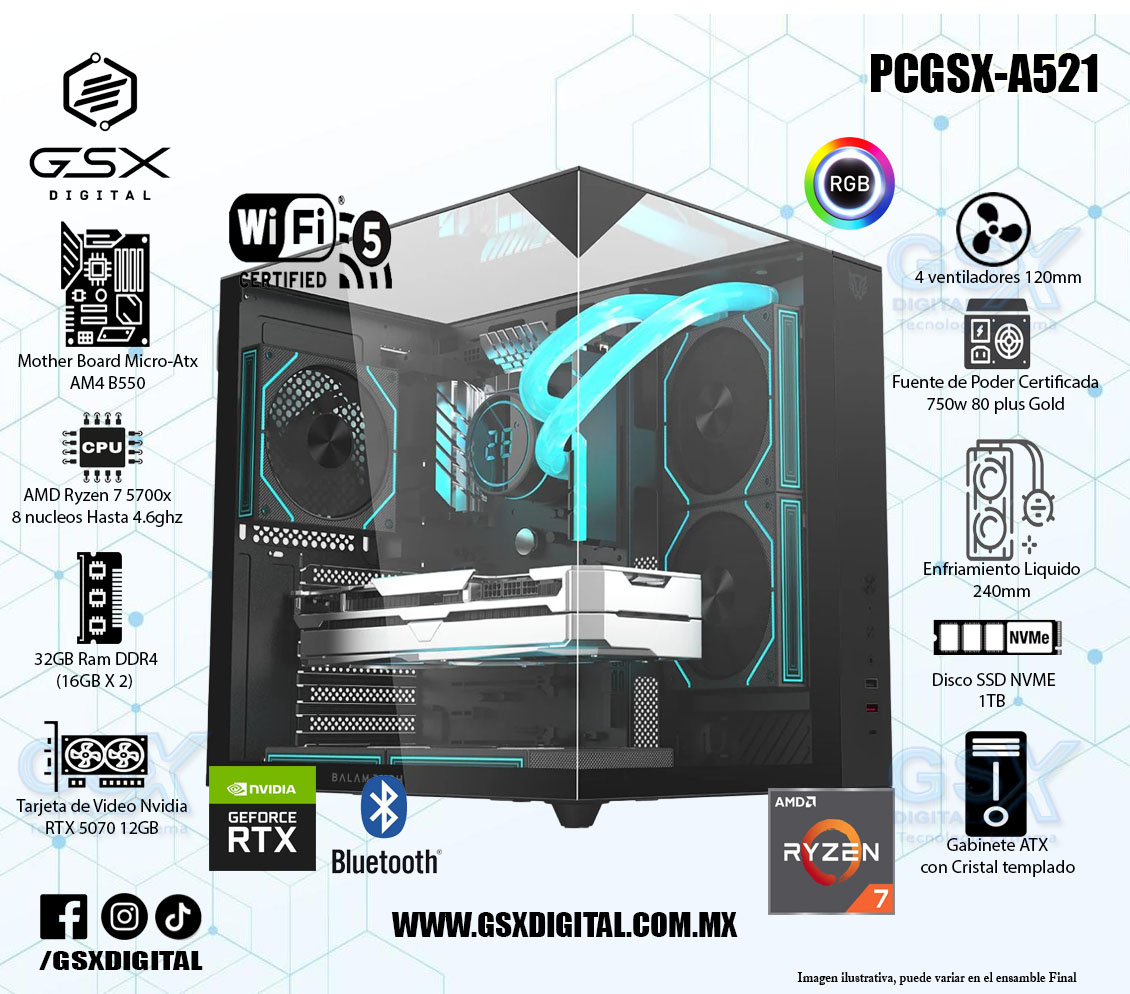 Pc Gamer Ryzen 7 5700X - RTX 5070 12GB - 32Gb RAM Rgb - 1Tb SSD Nvme - Fuente 750W Certificada - WIFI y Bluetooth - Enfriamiento Liquido PCGSX-A521