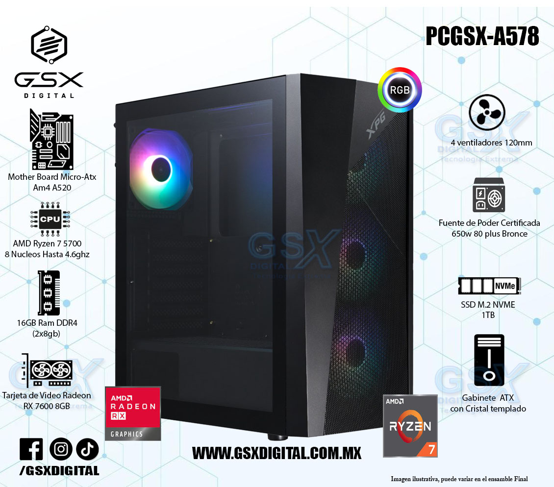 Pc Gamer Ryzen 7 - RX 7600 8GB - 16Gb Ram Ddr4 - SSD 1TB Nvme - Fuente certificada 650W PCGSX-A578