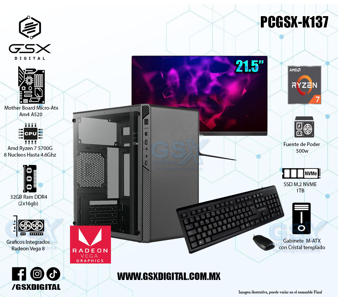KIT PC AMD RYZEN 7 5700G - 32GB RAM DDR4 - 1TB SSD - GABINETE CON FUENTE DE 500W - MONITOR LED 21.5 - TECLADO Y MOUSE PCGSX-K137