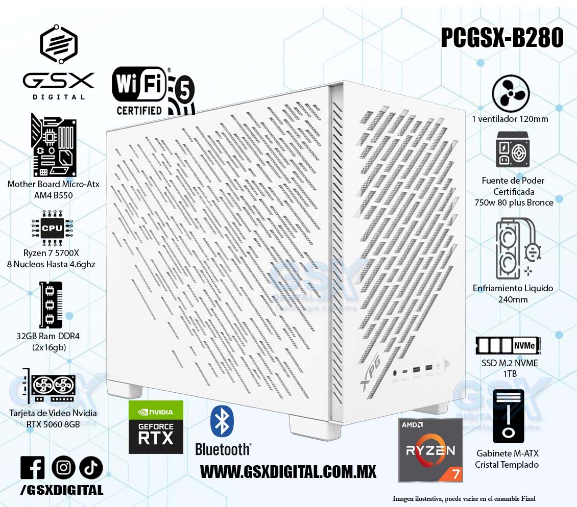 PC AMD RYZEN 7 5700X - RTX 5060 8GB - 32GB RAM RGB - 1TB SSD NVME - FUENTE 750W CERTIFICADA - ENFRIAMIENTO LIQUIDO - WIFI Y BT PCGSX-B280