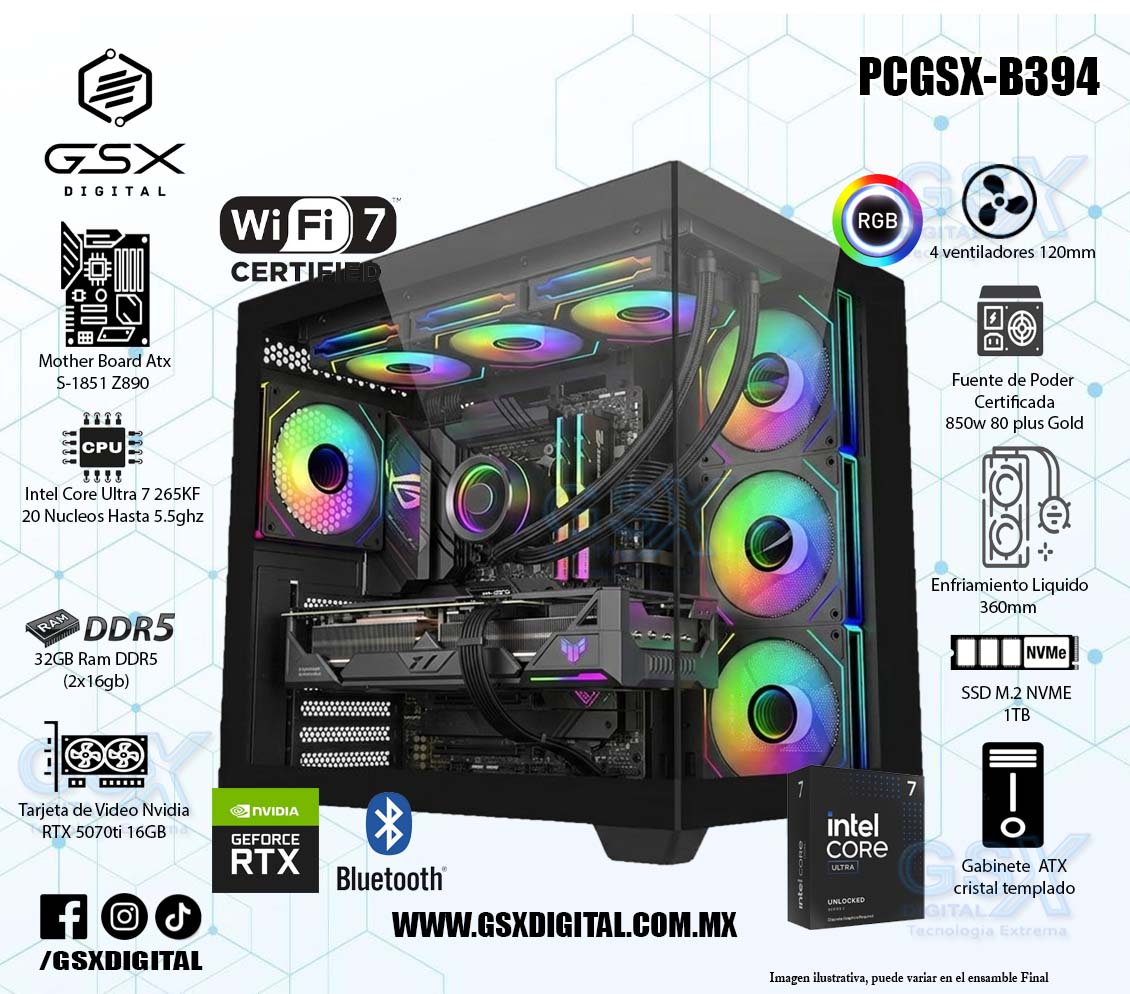 PC INTEL CORE ULTRA 7 265KF - RTX 5070TI 16GB - 32GB RAM DDR5 - 1TB SSD NVME - FUENTE 850W CERTIFICADA - WIFI Y BT PCGSX-B394