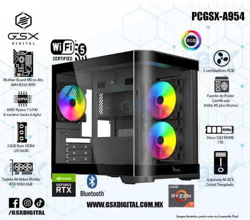 Paquete Pc Gamer Ryzen 7 - RTX 5050 8GB - 32Gb Ram RGB - SSD 1TB Nvme - Fuente 650W CERTIFICADA - Wifi y Bluetooth Monitor 27 Full HD - Teclado y mouse PCGSX-A954KM