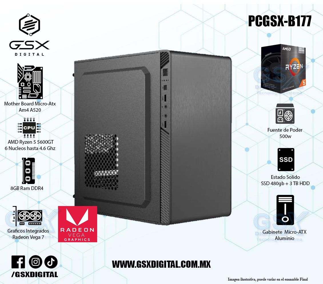 Pc Amd Ryzen 5 - 8Gb Ddr4 - 480Gb Ssd - Disco Duro 3TB - Gabinete Con Fuente De 500W PCGSX-B177