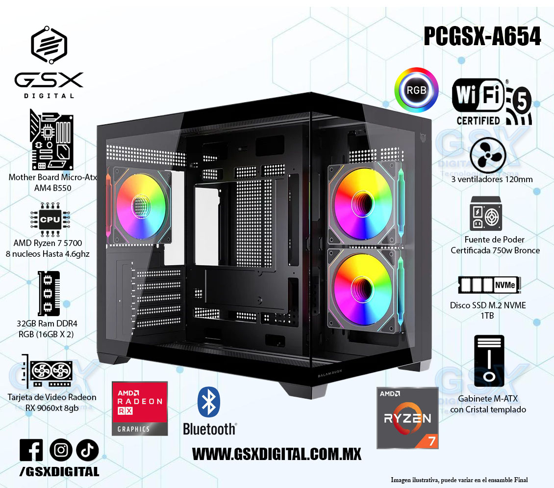 Pc Amd Ryzen 7 - Rx 9060xt 8Gb - Ram DDR4 32gb - SSD 1Tb Nvme - Fuente Certificada 750W - Wifi y Bluetooth PCGSX-A654