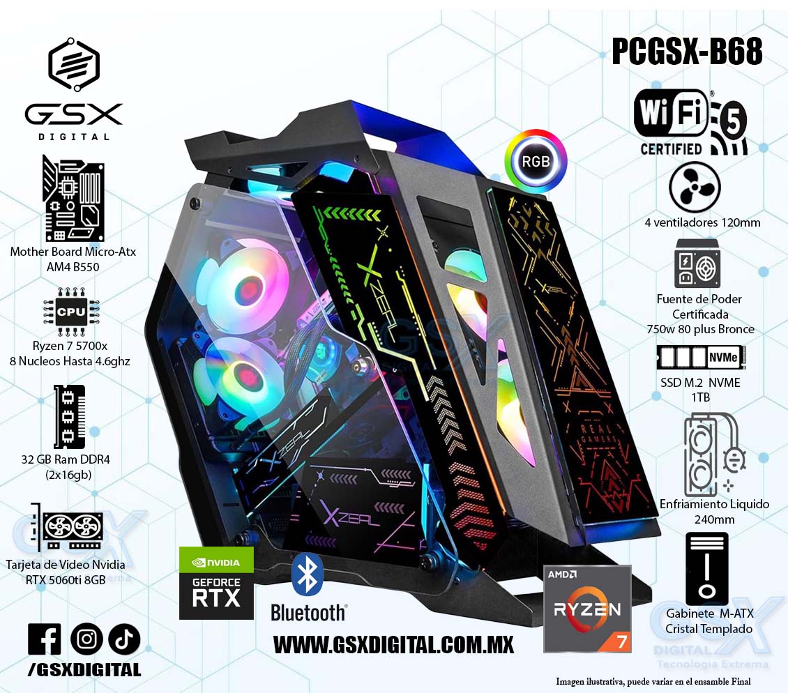Pc Amd Ryzen 7 5700X - Rtx 5060ti 8gb - Ram 32gb ddr4 - SSD 1Tb Nvme - Fuente Certificada 750W - Enfriamiento liquido - Wifi y Bluetooth PCGSX-B68