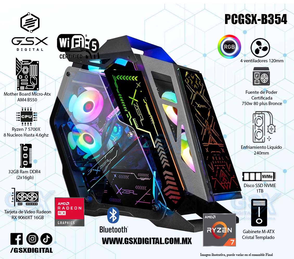 Pc Amd Ryzen 7 5700X - RX 9060XT 16gb - Ram 32gb ddr4 - SSD 1Tb Nvme - Fuente Certificada 750W - Enfriamiento liquido - Wifi y Bluetooth PCGSX-B354