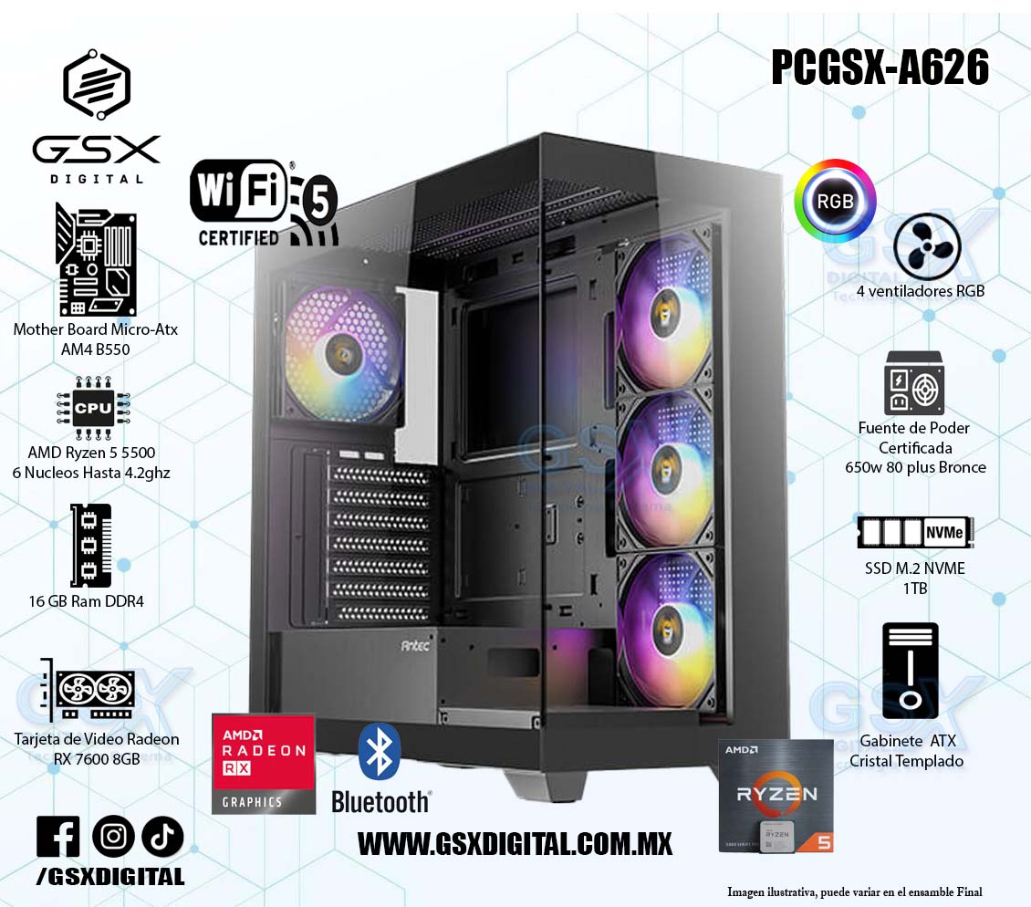 Pc Gamer Ryzen 5 - Radeon RX 7600 8GB - 16Gb Ram - SSD 1TB Nvme - Fuente 650W CERTIFICADA - WIFI Y BLUETOOTH PCGSX-A626