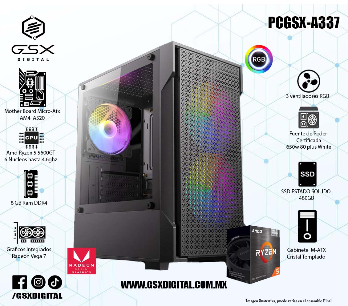 Pc Gamer Ryzen 5 5600GT - 8Gb Ram ddr4 - SSD 480GB - Fuente Certificada 650W - Graficos Radeon Vega 7 PCGSX-A337