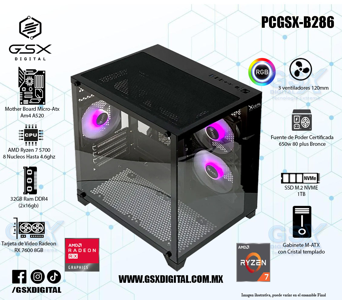 Pc Gamer Ryzen 7 - RX 7600 8GB - 32Gb Ram - SSD 1TB Nvme - Fuente certificada 650W PCGSX-B286