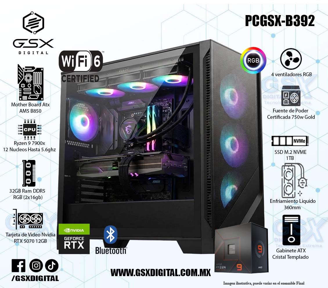 Pc Gamer Ryzen 9 7900X - RTX 5070 12GB - 32Gb RAM DDR5 - 1Tb SSD Nvme - Fuente 750W Certificada - WIFI y Bluetooth - Enfriamiento liquido PCGSX-B392